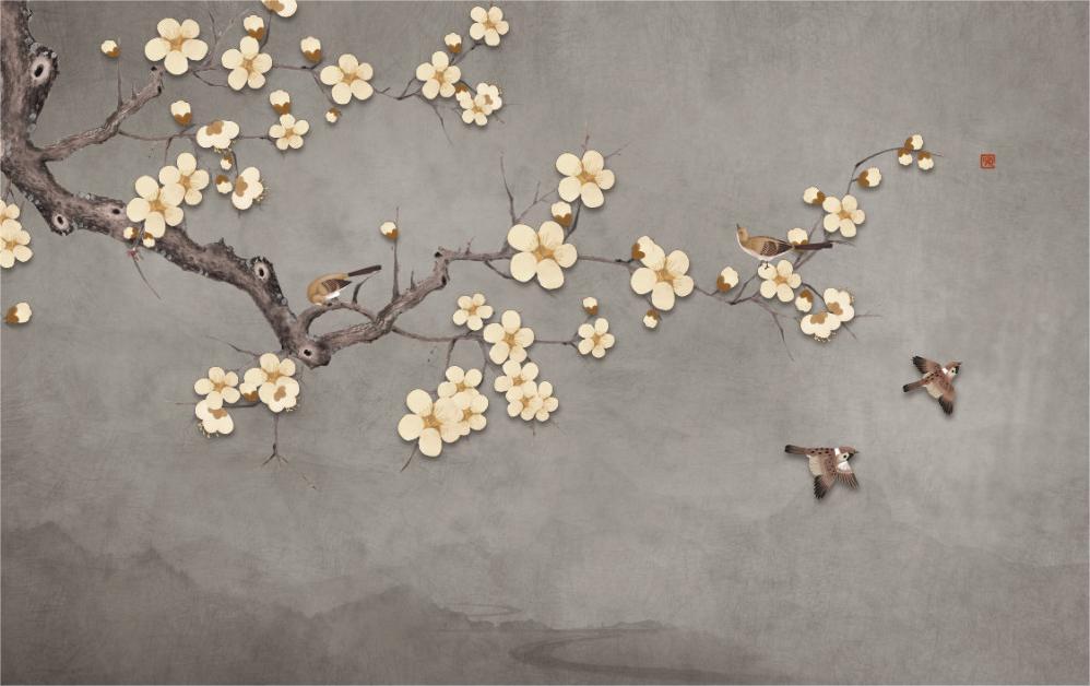 每日更新 | 新中式手绘梅花喜上眉梢壁画背景墙MT-416