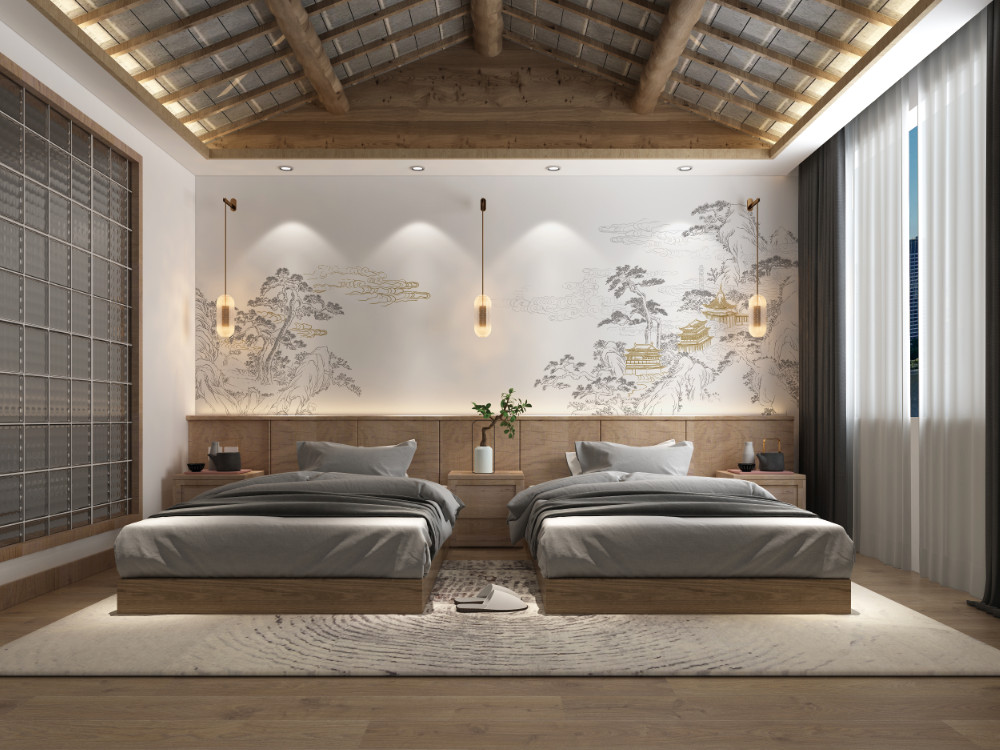 中式 | 卓越风华 新中式简约山水楼阁线条印加绣壁画背景墙WRT-002