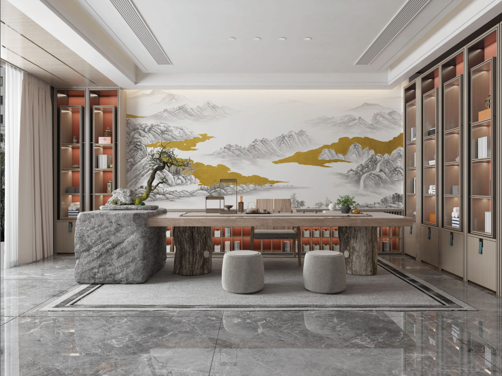 中式 | 鎏金岁月 新中式简约祥云山水壁画背景墙LSH-045