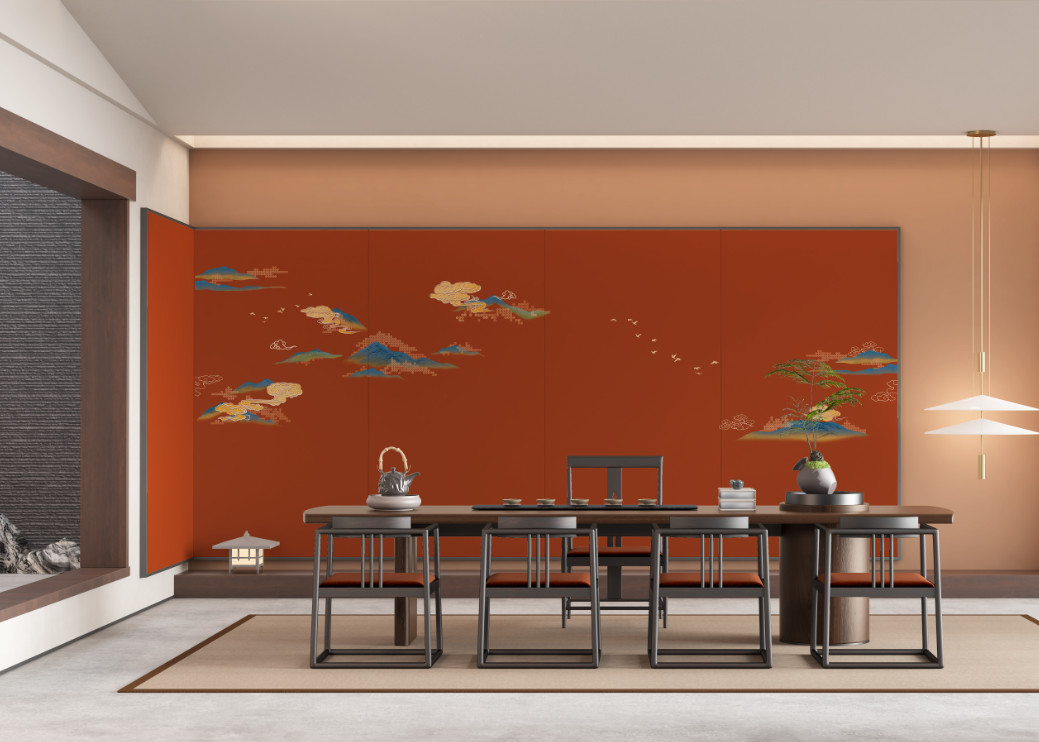 中式 | 东方氣韵 手绘山水印加绣壁画背景墙CX-108