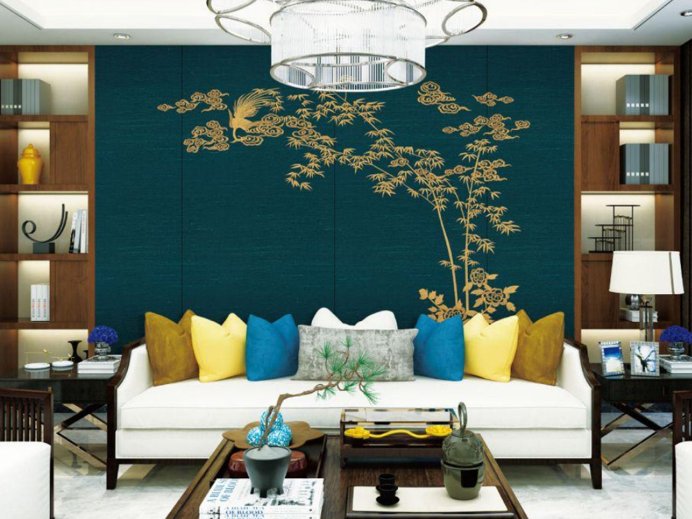 刺绣 | 新中式一枝梅山水印加绣壁画背景墙QS-G511