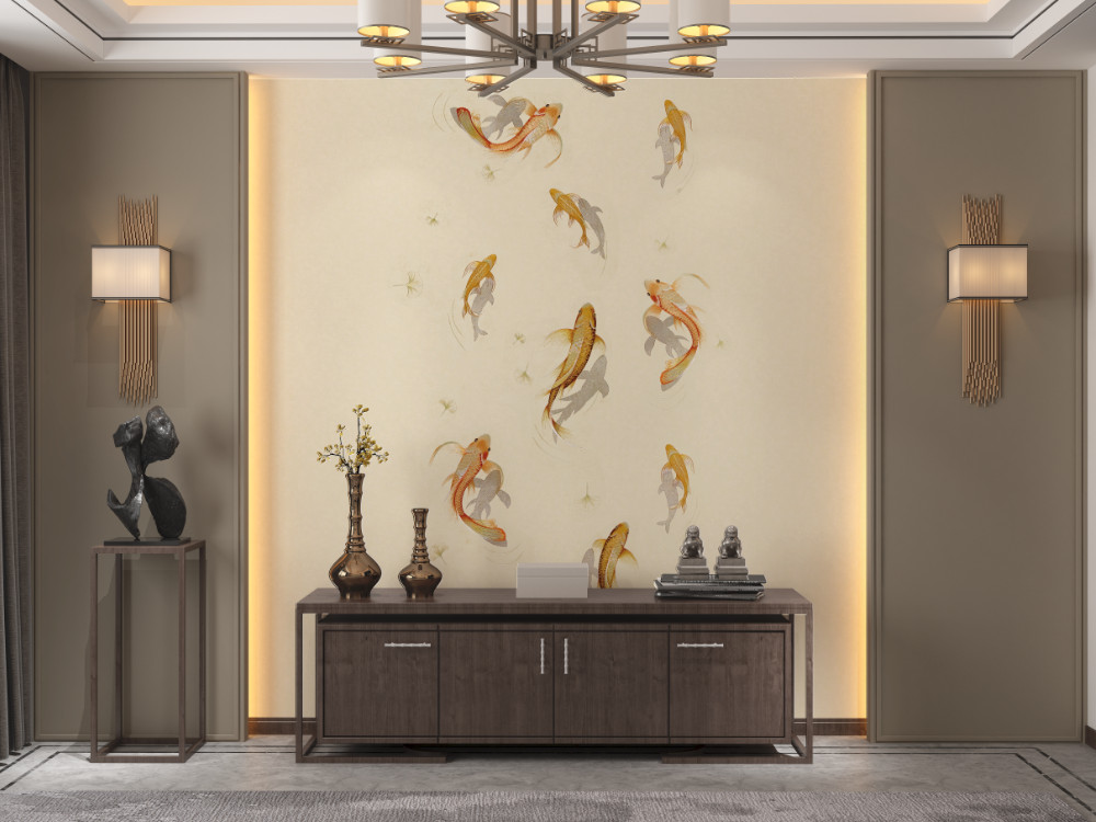 刺绣 | 新中式九鱼图独绣背景墙JX-245